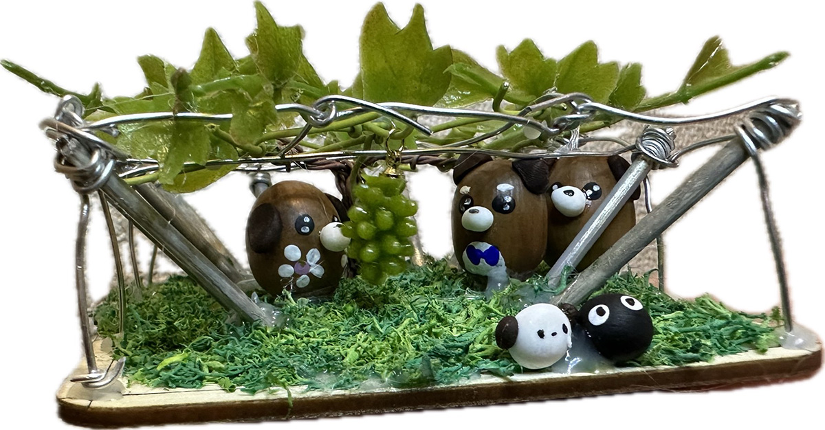 ぶどうやももの廃材を使用したキッドを使用。どんぐりやぶどうの小型パーツを使用して世界に一つだけ自分だけのぶどう棚・もも畑を作ります。