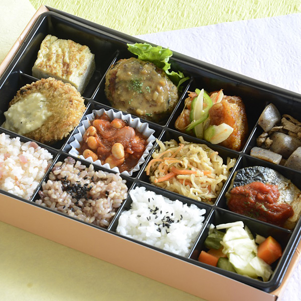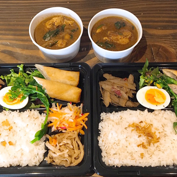 テイクアウトのお弁当は、メインの他に野菜中心の身体に優しいお惣菜が付いています。旅先で出会ったような料理だったり、懐かしいおふくろの味だったりが詰まったお弁当です。全部ひとりで作っている為、事前にご予約いただけると、スムーズにお渡し出来ます。